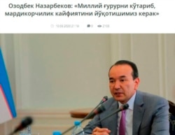 Ўзбекистон маданият вазири Озодбек Назарбеков тарихчи олимлар билан учрашувда ўзбек халқининг миллат сифатида ишончи сусайиб кетгани ҳақида гапирди (www.xabar.uz, 10 март). “Ҳозир бизда миллат сифатида ўзимизга бўлган ишонч жуда сусайиб кетган. Таъбир жоиз бўлса, мардикорчилик кайфияти бор. Биз миллий ғуруримизни кўтариш учун ғояни кучайтиришимиз лозим. Ёшларимизнинг қаддини кўтаришимиз лозим”, деган у. Миллий ғурурни кўтаришда эса О. Назарбеков тарихий фильмларнинг аҳамияти катта эканини таъкидлаган.