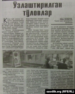 Фарғона вилояти Тошлоқ тумани электр корхонаси раҳбари бошчилигидаги жиноий гуруҳ 415 миллион сўмдан ошиқ маблағни ўмарган (“Ҳуқуқ”, 23 март). Жиноий гуруҳга электр корхонаси раҳбари билан бирга унинг ўринбосари, бош ҳисобчи ва бош муҳандис кирган. Электр корхонасининг исми ошкор этилмаган раҳбарлари уч йил давомида “Uzpaynet” шахобчасига фуқаролардан тўлов сифатида топширилган нақд пулни ўзлаштириб келган. Кирим қилинмасдан ўзлаштирилган квитанциялар сони 6000 га яқин экани маълум қилинган. Электр корхонаси раҳбарлари, шунингдек, улгуржи ва чакана истеъмолчилардан қарзларни ундиришга ҳам лоқайдлик қилган. Хабарга кўра, Тошлоқ тумани электр корхонаси раҳбарларига давлат етказилган 415 миллион сўм маблағни қайтариш мажбурияти юкланиб, озодликдан маҳрум этиш жазоси тайинланган.