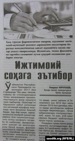 “Афсуски, айрим мансабдор шахсларнинг мавжуд ижтимоий-иқтисодий ҳолатни билмаслиги, бир сўз билан айтганда, уларнинг оёғи ердан узилиб қолиши фуқароларнинг манфаатларига зарар келтиради, давлат ҳокимияти ва бошқаруви органлари фаолиятининг обрўсизланишига олиб келади”, дейилади “Ҳуқуқ” газетасида эълон қилинган бошқа бир мақолада.