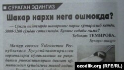 Ўзбекистонда шакар нархи 5200 сўмга кўтарилиши одамларда турли саволлар туғдирмоқда (“Оила даврасида”, 27 апрель). Ўзбекистон Хусусийлаштирилган корхоналарга кўмаклашиш ва рақобатни ривожлантириш давлат қўмитасига кўра, бунинг асосий сабаб шакар учун четдан келтириладиган шакарқамиш хомашёсининг нархи ошиб кетганидир. “Вазирлар Маҳкамасининг жорий йил 31 мартдаги тегишли ҳужжатига асосан, бугунги кунда шакарнинг чакана нархи 5200 сўм этиб белгиланган. Унга кўра, шакарни ушбу нархдан юқори сотиш мумкин эмас” деб маълум қилади давлат қўмитаси.