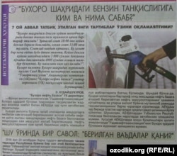 Бухоро шаҳридаги ёнилғи қуйиш шахобчаларида бензин танқис бўлиб қолмоқда (“Даракчи”, 27 апрель). Эрталаб соат 10 да берилган бензин 13:00 гача тугамоқда. “Соатлаб навбат кутамиз. Бу ҳолат бир неча ойдан буён давом этмоқда. Кейин ёнилғи қуйиш шахобчасидаги 2800 сўмлик бензинни кўчадан баклажкада 4000 сўмдан олишга мажбур бўляпмиз”, дейди бухоролик Саид Яҳёев. Ёнилғи тақчиллиги ҳолатини “Бухоро нефть базаси” корхонаси раҳбари Э.Худойшукуров шундай изоҳлаган: “Бухоро вилояти бўйича талаб этиладиган миқдорларга нисбатан кам етказиб берилишининг асосий сабаби нефтни қайта ишлаш заводларидан нефть базага белгиланган миқдордан кам маҳсулот юклаб берилишидир. Нефть маҳсулотларининг кам ортиб берилиши нефть хомашёси пул маблағларига боғлиқ бўлиб қолмоқда”. Газета шахобчаларга бензин талаб даражасида етказиб берилмас экан, чайқовчиликка барҳам бериш имконсизлигини эслатади.
