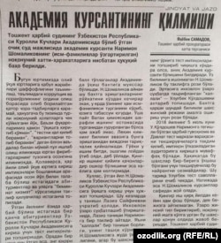 Ўзбекистон Республикаси Қуролли кучлари академиясига жиноий йўл билан ўқишга кириш ҳолати аниқланди (“Ҳуқуқ”, 27 июнь). Бу ҳақда Тошкент ҳарбий прокуратураси катта терговчиси Яҳёбек Самадов маълум қилган. Академияга ҳужжат топширган абитуриент йигит 2018 йилнинг 5 июль куни тест имтиҳонига ўзига ўхшайдиган танишини киритган. Абитуриент ва унинг таниши бир-бирига жуда ўхшагани сабаб текширувчилар бу найрангни сезмаган. Шу тариқа абитуриент академия курсантлари сафидан ўрин олган. Қайд этилишича, мазкур жиноят фош этилиб, ноқонуний ишга қўл урганларга тегишли жазо тайинланган. Жиноий ишга оид бошқа тафсилотлар очиқланмаган. Мутлақо бегона шахснинг имтиҳонга киришига йўл қўйган текширувчиларга қандай чора кўрилганига ҳам ойдинлик киритилмаган.