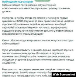 Блогер Ферузхон Ёқубхўжаев Телеграмдаги саҳифасида дронлар хавфли экани ҳақидаги фаразларни “аҳмоқона” деб атаган. “Учувчисиз бошқариладиган фуқаровий қурилмаларга оид ваҳима ва жазаванинг боиси нима эканини ҳеч тушуна олмадим. Наҳотки, бутун бошли ҳукуматда кучишлатар тузилмаларнинг ялпи васвасаси таъсири тушмаган маърифатли инсонлар топилмаса?” деган Ф. Ёқубхўжаев.