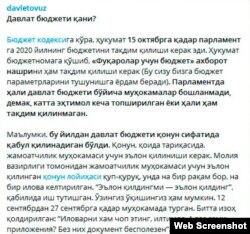 Вазирлар Маҳкакамаси бу йил ҳам парламентга бюджетномани вақтида тақдим этмади, деб хабар берди Телеграмдаги Davletov.uz канали. “Бюджет кодексига кўра, ҳукумат 15 октябрга қадар парламентга 2020 йилнинг бюджетини тақдим қилиши керак эди. Ҳукумат бюджетномага қўшиб, “Фуқаролар учун бюджет” ахборот нашрини ҳам тақдим қилиши керак”, дея эслатади канал.
