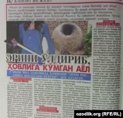 Хоразм вилояти Урганч шаҳрида яшовчи аёл эрини ўлдириб, ҳовлига кўмгани фош қилинди (“Даракчи”, 23 ноябрь). Жиноят ишлари бўйича Хоразм вилоят суди судьяси Улуғбек Бактурдиевга кўра, жиноят асли 2015 йилнинг 2 ноябрида рўй берган ва орадан икки йил ўтганидан кейингина очилди. Исми ошкор этилмаган аёл маст ҳолдаги эри билан жанжаллашиб қолган ва уни болта билан уриб ўлдирган. Кейин жасадни ҳовлига кўмган, устидан бетон ётқиздириб, тандир қурдирган. Яқинларига эса эри чет элга ишлагани кетганини айтган. Шу тариқа аёл эри дафн этилган ҳовлида икки қизига тўй қилган. Орадан икки йил ўтса-да, акасидан дарак йўқлигидан шубҳаланган марҳумнинг синглиси ҳуқуқ-тартибот идораларига мурожаат қилган. Тергов-суриштирув жараёнида қотилликни марҳумнинг хотини амалга оширгани ва бу ишдан қизлари ҳам хабардор бўлгани аниқланган. Жиноят ишлари бўйича Хоразм вилоят суди қотил аёлга 13 йил озодликдан маҳрум этиш жазоси тайинлаган.