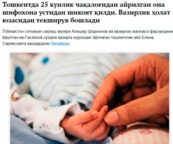 25 кунлик чақалоғидан айрилган тошкентлик аёл Елена Саревская шифокорлар устидан арз қилди (www.daryo.uz, 3 декабрь). Мусибатзада аёлга кўра, болалар жонлантириш бўлимларида элементар дори-дармонлар, кислород ниқоблари етишмайди.