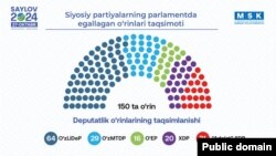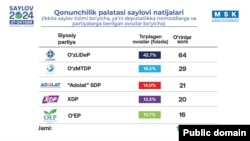 МСК матбуот хизмати эълон қилган дастлабки натижаларга кўра, парламент қуйи палатаси депутатлиги учун сайловда 150 та ўриндан 64 тасини (42,7 фоиз) ЎзЛиДеП , 29 тасини (19,3 фоиз) “Миллий тикланиш” партияси , 21 тасини (14 фоиз) “Адолат” партияси, 20 тасини (13,3 фоиз) ХДП, 16 тасини (10,7 фоиз) эса Экологик партия эгаллашга муваффақ бўлган.