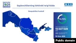Мулозимга кўра, якшанба кунги овоз беришда сайлов рўйхатига киритилган 19 миллион 944 минг 859 нафар сайловчидан 15 миллион 27 минг 529 нафари участкаларга келиб овоз берган.