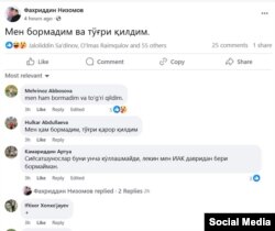 Тўрт соат ичида пост тагида қолдирилган 25та изоҳнинг деярли барчасида сайловга бормаганликлари таъкидланган. 60га яқин киши Низомовнинг қарорини қўллаб, унинг постига лайк босишди.