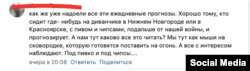 Россиянинг “VKontakte” ижтимоий тармоғида фойдаланувчилардан бири: “уруш ҳақидаги кундалик башоратлардан жуда зерикдим”, деб ёзган. “Низоли ҳудуддан узоқда, Нижний Новгород ёки Красноярскда диванда ўтириб пиво ва чипс билан башорат қилиш жуда яхши. Бироқ буларни ўқиб нимани ҳис қиламиз? Биз товада қовурилаётган сичқонга ўхшаймиз. Ҳамма нима бўлаётганини пиво ва чипслар олиб қизиқиш билан кузатмоқда.”