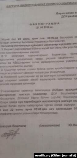 Ҳурматли давлат солиқ қўмитаси раиси Беҳзод Анварович, сиз тизимга қайтганингиздан сўнг жуда кўп ислоҳотлар бўлди, янги концепцияга қўл урдингиз. Аммо Фарғона вилоят бошқарма бошлиғи ўринбосари каби раҳбарлар ислоҳотларга соя солмоқда. Унинг ўрнига одоб-ахлоқ нормаларига риоя этувчи, ақл-ҳуши жойида, муносиб мансабдор тайинласангиз”.
