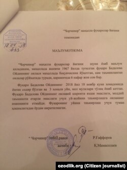 Туман раҳбарияти қабул қилмайди. Йўлкира учун қўшнидан қарз олиб, вилоят ҳокими қабулига бордим, аммо киритишмади. Хотин-қизлар қўмитасидан олифта вакил келиб, бизларни русчалаб сўкиб кетди.