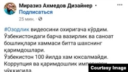 “Озодлик видеосини охиригача кўрдим. Ўзбекистондаги барча вазирлик ва саноат бошлиқлари ҳаммаси битта шахснинг қариндошлари. Ўзбекистон 100 йилда ҳам юксалмайди. Коррупция ва қариндошлик империяси чўққисида. Афсус... Адолатни тушингизда кўрасиз энди”.