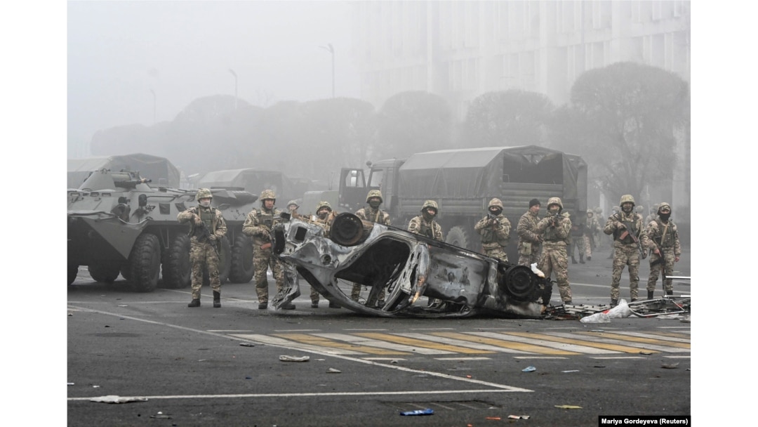 2022 йил январь ойида ҳукуматга қарши намойишлар бўлиб ўтган Олмаота марказий майдонида ҳарбийлар кўринмоқда.